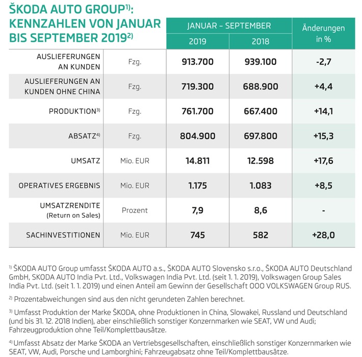 SKODA AUTO Group(1) – Kennzahlen von Januar bis September 2019(2)