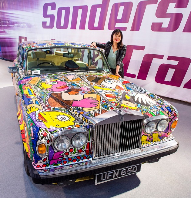 Filmfreunde schauen bei diesem Fahrzeug mindestens zwei Mal hin: Der Leipziger Pop-Art-Künstler Michael Fischer präsentiert in Essen einen Rolls Royce in James-Bond-Optik. Die Grundlage für Fischers Schöpfung ist ein Silver Shadow II aus dem Jahr 1978, seinerzeit eines der absoluten Top-Modelle der Luxus-Klasse. Fischer schuf mit seinem prägnanten comicartigen Mal-Stil ein verrücktes Gemälde auf vier Rädern, das fahrbereit ist. Das Thema der Bemalung ist der Film Goldfinger aus dem Jahr 1965. So ist der gedrungene nordkoreanische Söldner Oddjob auf der Kofferraumhaube mit einem radioaktiven Atomkoffer dargestellt, genau wie die mit Gold überzogene Jill Masterson an der Fahrzeugseite verewigt ist.