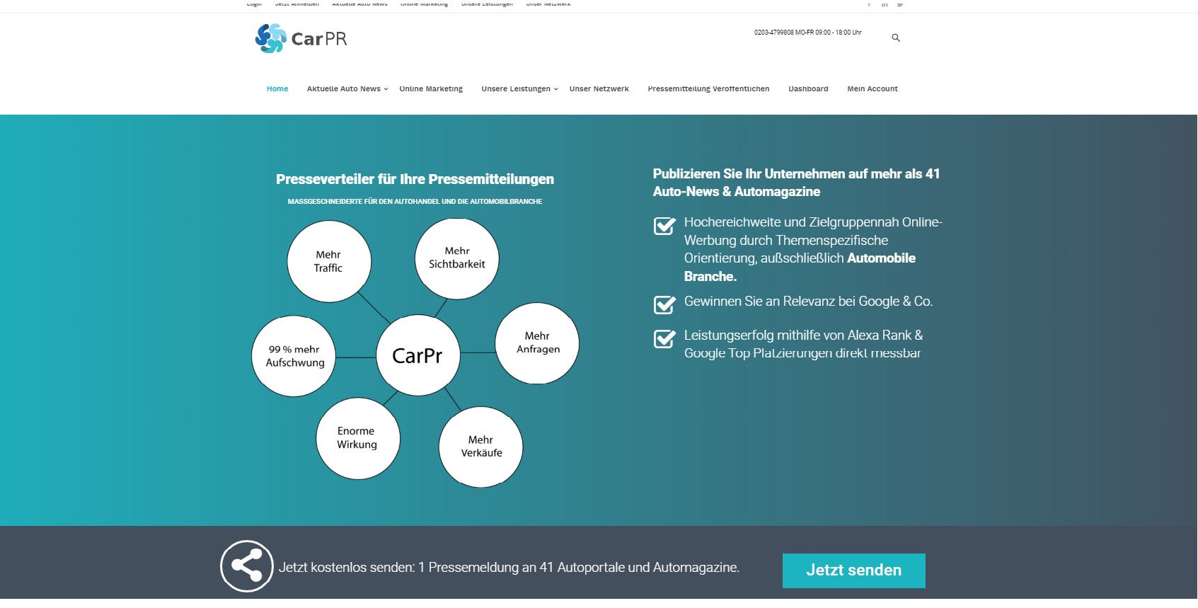 Sie arbeiten rund um das Thema “Auto“? Veräußern Gebrauchtwagen oder Autozubehör, betreiben eine Verwertung von Autoteilen oder eine Kfz-Werkstatt? Sie sind Anbieter von Kfz-Versicherungen? Dann sollten Sie CarPR kennenlernen. CarPR ist auf Marketingstrategien im Automarkt in seinem weitesten Sinne spezialisiert und verfügt mit seinem umfangreichen Netzwerk über genau die richtigen Adressaten, um Ihre Domain und ihre Unterseiten weit nach vorne zu bringen.